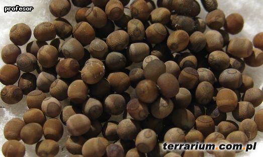 Są koloru brązowego, zbliżone kształtem do okrągłej kulki wielkości ok. 2×1,5 mm, składane bezpośrednio na podłoże.