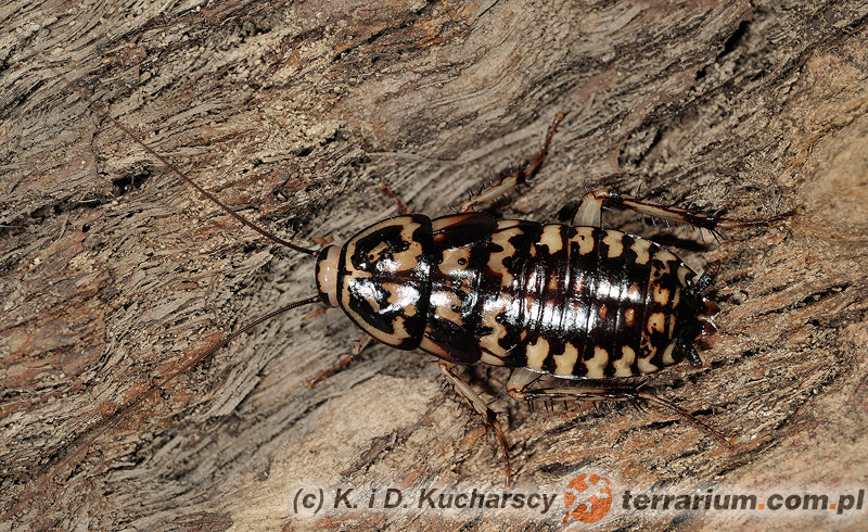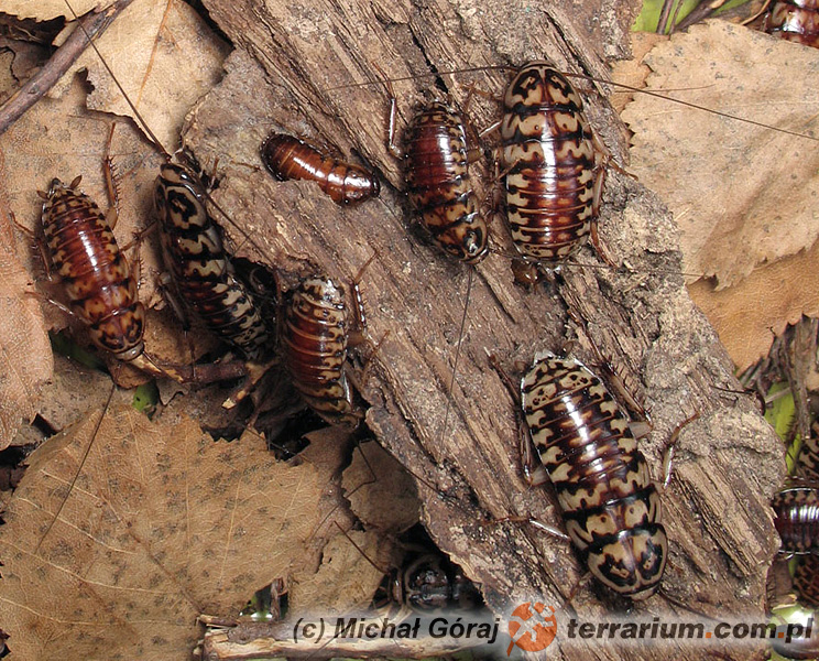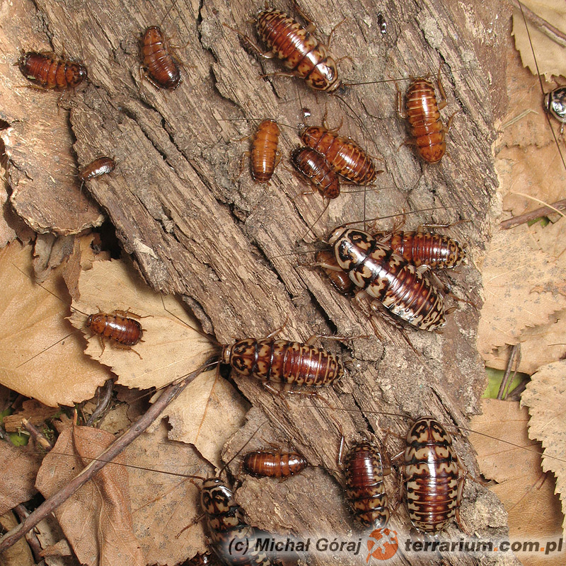W opisanych warunkach larwy dorastają po około 10-12 tygodniach. Po kolejnych 2 tygodniach osiągają dojrzałość płciową i przystępują do kopulacji. Samice przez około tygodnia noszą uformowaną ootekę, po czym przyklejają ją do kory i stałych elementów wystroju terrarium. Po około 5-6 tygodniach inkubacji z ootek wykluwają się młode (kilkanaście-kilkadziesiąt sztuk). Młode żerują na powierzchni podłoża, pod płatami kory.