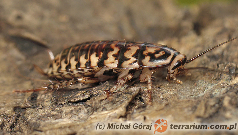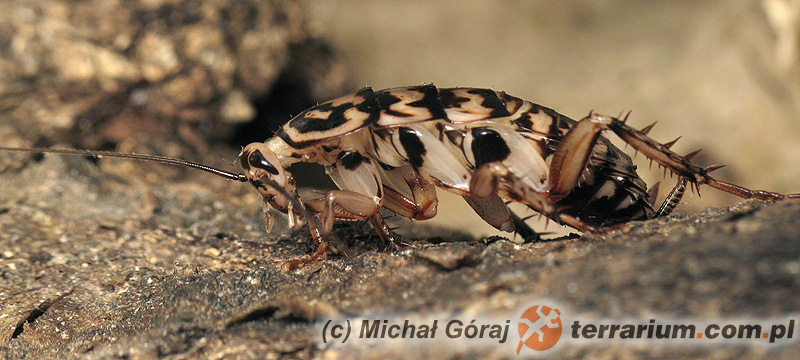 Terrarium o wymiarach 30x30x40 cm, lub większe (w zależności od liczby osobników). Na dnie cienka (2-3 cm) warstwa podłoża – mieszaniny torfu/włókna kokosowego, piasku, próchna drzew liściastych oraz rozdrobnionych liści dębu lub buka. Karaczany najchętniej żerują na powierzchni substratu. Ważne jest zapewnienie dużej liczby kryjówek – idealnie sprawdzając się w tej roli warstwy płatów kory lub rury z kory dębu korkowego. Samice chętnie przyklejają do nich ooteki. Podłoże powinno być sypkie, lekko wilgotne – w warunkach naturalnych karaczany żyją w okolicy o dosyć suchym klimacie. W dzień temperatura powinna wynosić około 28-32°C, w nocy może spadać do 18-22°C. Ze względu na niską tolerancję na wilgoć ważne jest zapewnienie dobrej wentylacji. Terrarium może stać na macie grzejnej lub kablu, nie jest konieczne bezpośrednie oświetlanie zbiornika. W mojej hodowli trzymam grupę mieszaną kilkuset osobników w pojemniku 40x60x30 cm z 2 otworami wentylacyjnymi (10×20 cm) zabezpieczonymi drobną siatką. Ponieważ młode dosyć dobrze wspinają się po gładkich płaszczyznach, aby uniemożliwić ucieczkę, warto posmarować brzeg pojemnika wazeliną lub smarem (pas 2-3 cm szerokości).