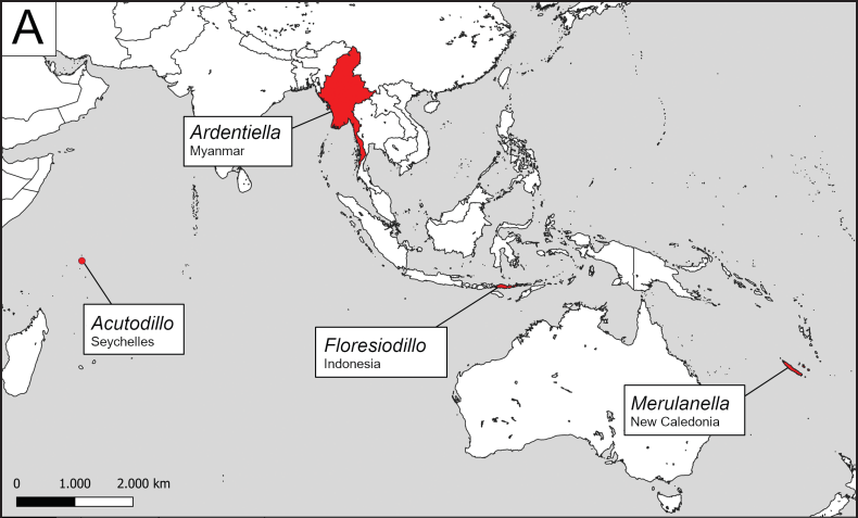 Rodzaje te można przypisać do różnych lokalizacji, podobnie jak Merulanella to endemit z Nowej Kaledonii, Ardentiella wywodzi się z okolic Mjanmy (dawniej Birmy), Floresiodillo z okolic Indonezji (wyspa Flores), zaś Acutodillo znajduje się najbliżej kontynentu afrykańskiego i zamieszkuje Seszele.