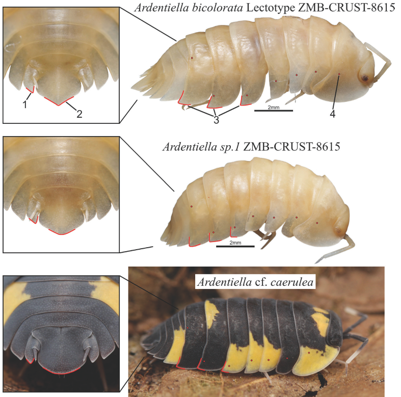 - Cubaris caerulea → Ardentiella caerulea – W obrębie tego gatunku powstało małe zamieszanie, ze względu na duże podobieństwo do Ardentiella (ex. Merulanella) bicolorata. Jeśli posiadamy ten gatunek warto zagłębić się w treść publikacji, która sugeruje występowanie jeszcze trzeciego, nieopisanego gatunku, który jest również podobny i był mylony z powyższymi. Na pewno dalsze rewizje ułatwią rozpoznanie który z tych trzech gatunków mamy w hodowli. Podstawowe różnice między tymi 3 gatunkami można zobaczyć na zdjęciach: