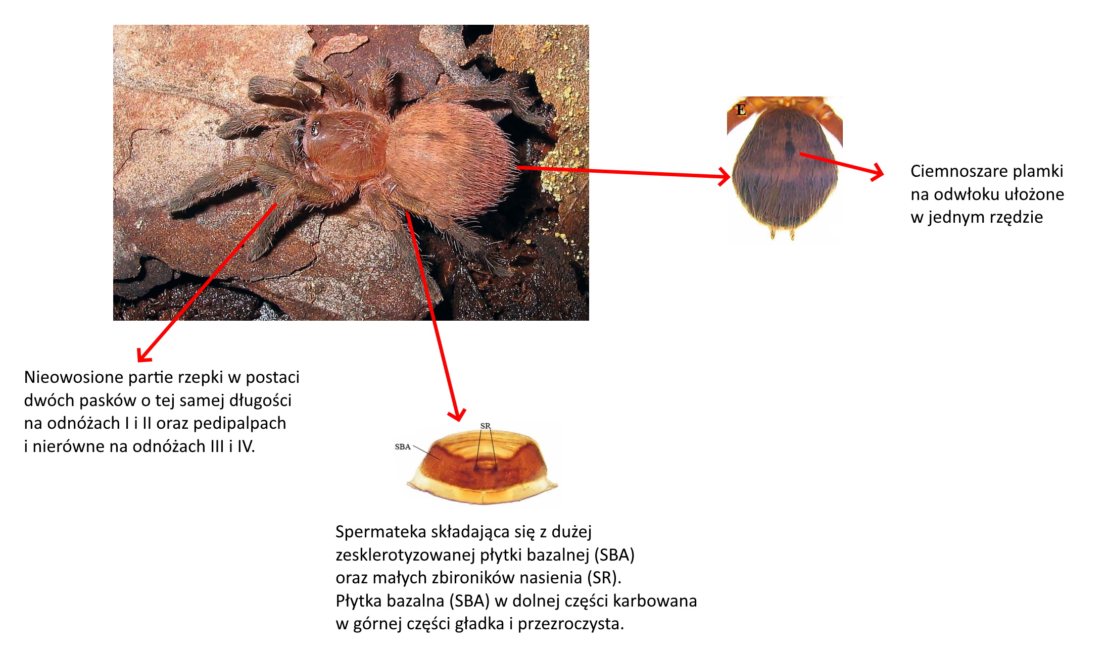 – spermateka samicy składa się z dużej zesklerotyzowanej płytki bazalnej i dwoma bardzo krótkimi zbiornikami nasienia spermateki. Płytka bazalna u nasady karbowana, zaś w wyższej parti gładka i przezroczysta.