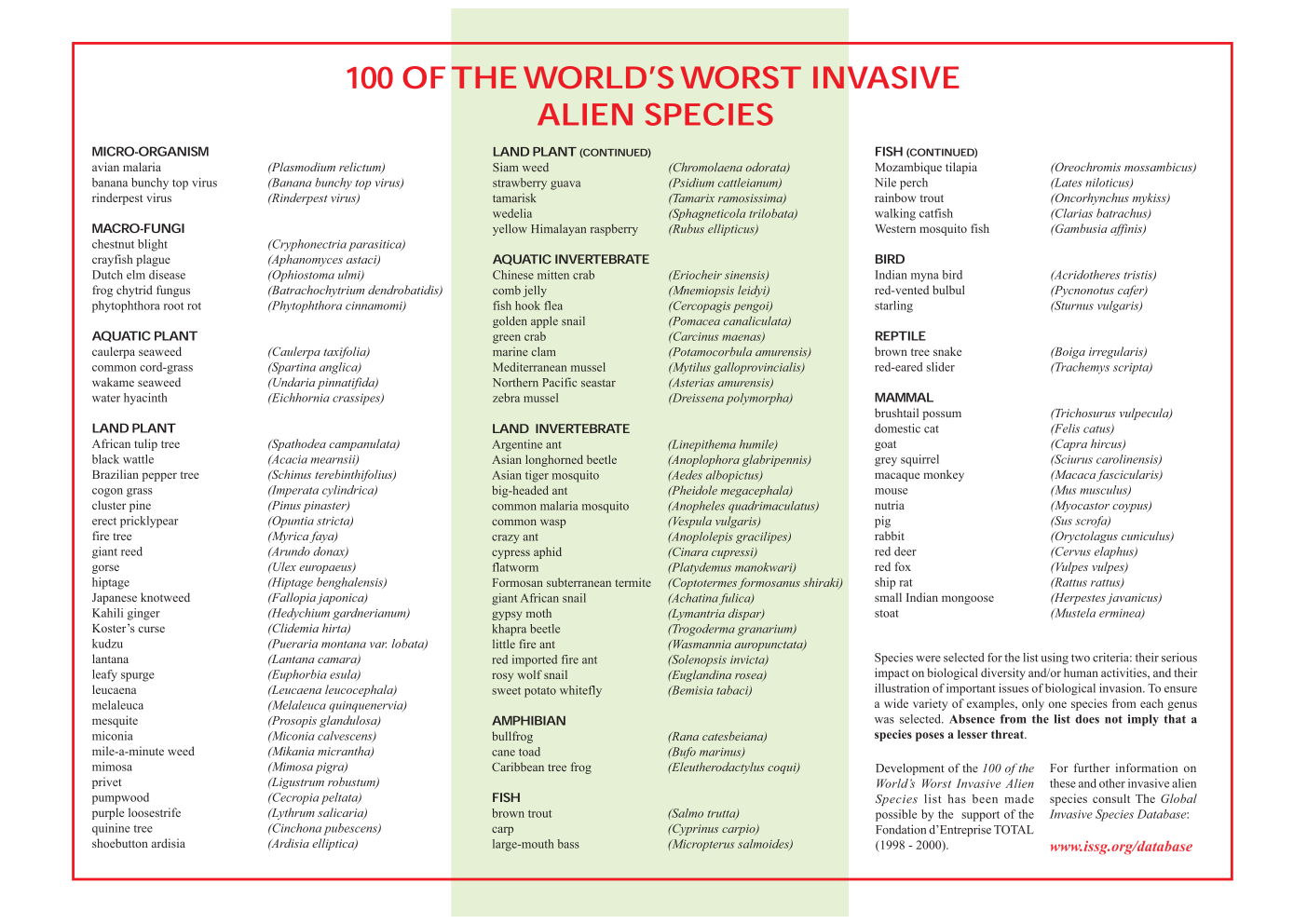- Lowe S., Browne M., Boudjelas S., De Poorter M. (2000) 100 of the World’s Worst Invasive Alien Species A selection from the Global Invasive Species Database. Published by The Invasive Species Specialist Group (ISSG). https://portals.iucn.org/library/node/8565