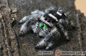 The Habronattus sunglow is a species of jumping spider that has „true” color vision. This is a male.