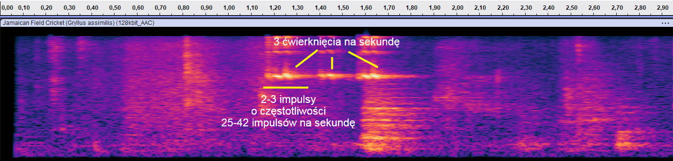 Dźwięk wydawany przez właściwego świerszcza kubańskiego (Gryllus assimilis) składa się z od 6 do 10 impulsów składających się na jedno ćwierknięcie, wydawanych w tempie 1-2 ćwierknięcia na sekundę. Częstotliwość impulsów to więcej niż 70 impulsów na sekundę (w temperaturze 25°C).