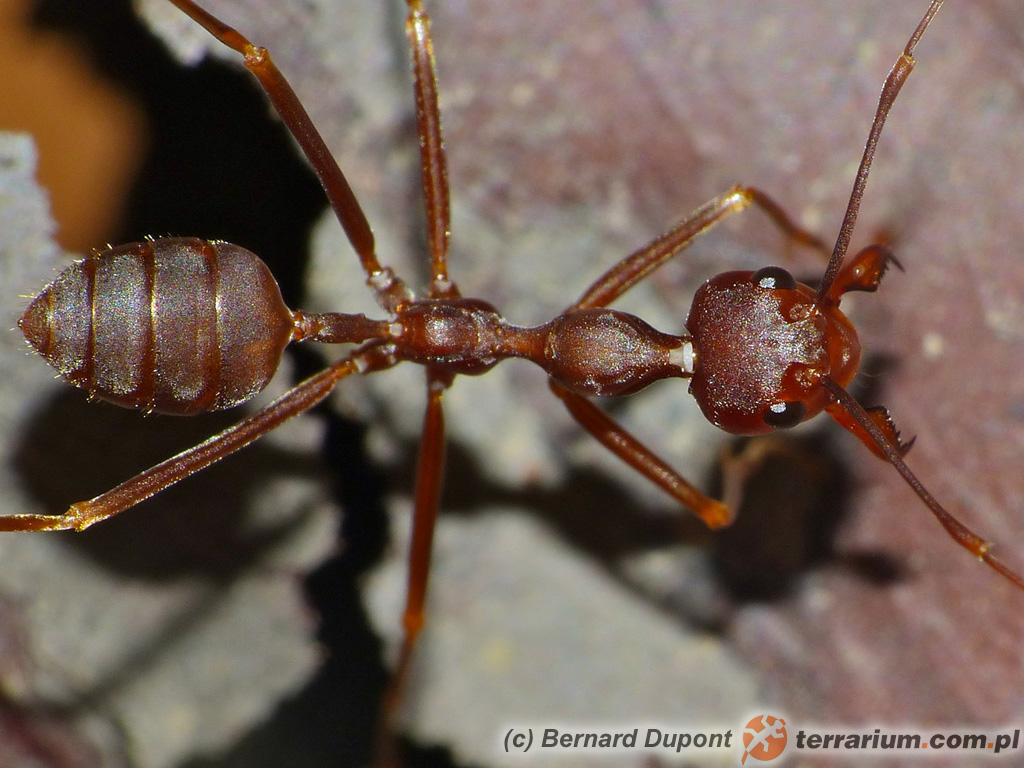 Oecophylla smaragdina czyli mrówka tkaczka należy do rodziny arborealnej (nadrzewnej). Występuje w cieplejszych rejonach Australii i Azji. Mrówki te charakteryzują się potężnymi, tworzącymi jedną całość, dziesiątkami gniazd zbudowanych z liści połączonych jedwabiem produkowanym przez larwy. Mrówka stosunkowo niewielka. Pomarańczowe. Posiadają długie, wytrzymałe odnóża i duże żuwaczki, które pozwalają na stałe rozbudowywanie swojej metropolii. Duże, złożone oczy widzące najmniejsze szczegóły. Posiadają dwanaście segmentów w swoich długich i smukłych czułkach. Królowe są zwykle zielono-brązowe a ich rozmiary sięgają nawet 25 milimetrów. Ich rodzime gatunki pochodzą z tropikalnych rejonów Afryki.