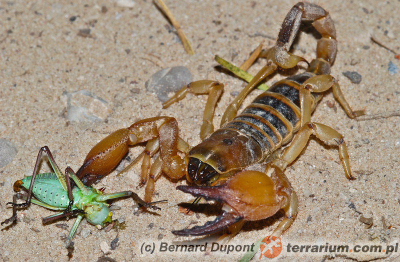 Świerszcze, karaczany, szarańcza itp. Skorpion ten jest bardzo żarłoczny i zjada wszystko co uda mu się upolować.