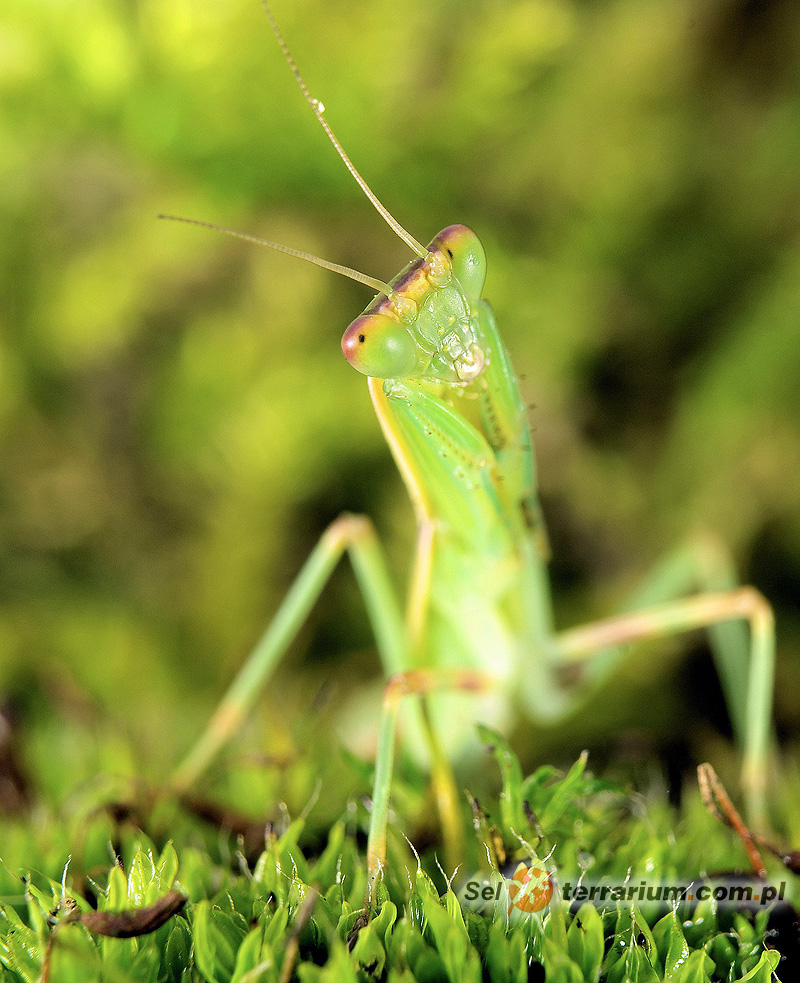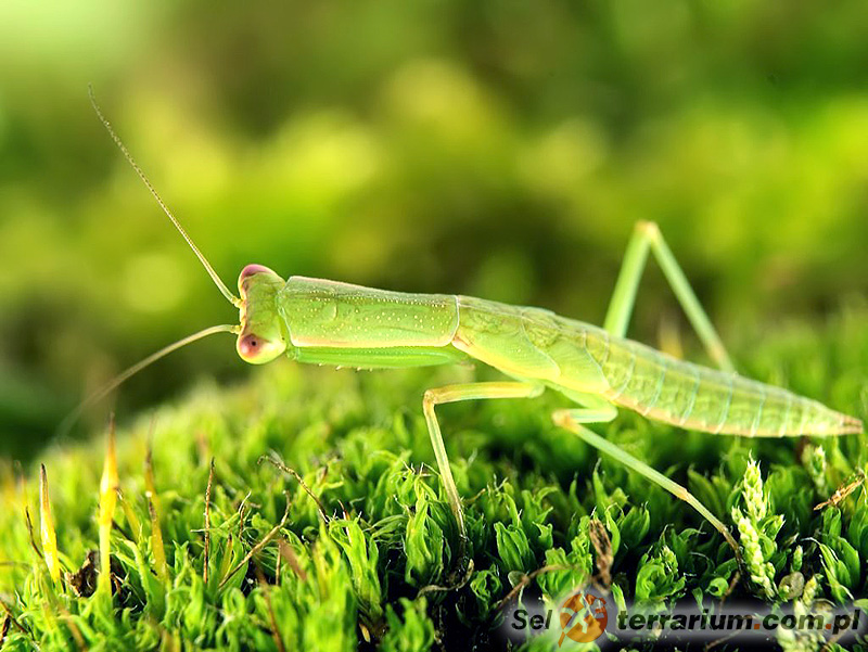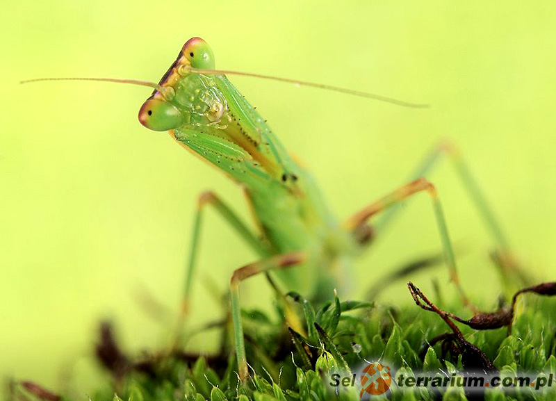 - Wystrój: W naturze zamieszkują nasłonecznione tereny krzewiaste, gdzie niezauważalnie przesiadują na liściach, czyhając na swoją ofiarę. Dlatego też terrarium należy wyposażyć w gałęzie i zielone rośliny.