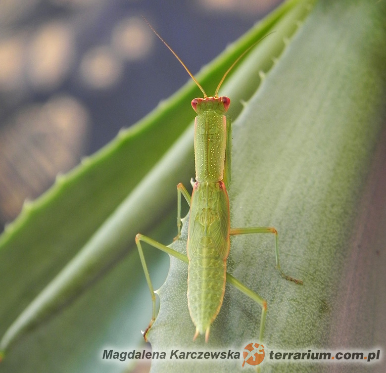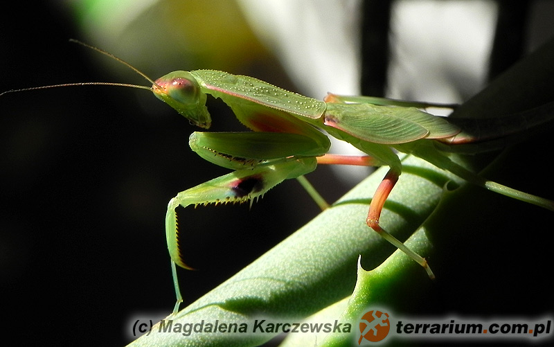 Gatunek ten jest stosunkowo łatwy do utrzymania i polecany początkującym. Zachwyca wyglądem i intensywnie zielonym ubarwieniem. Głowa tych modliszek jest trójkątna z dużymi dobrze rozwiniętymi i szeroko rozstawionymi oczami. Charakterystyczne niebiesko-fioletowe plamy na wewnętrznej stronie chwytaków dodają im uroku jak również pozwalają na odróżnienie od innych gatunków modliszek np. Miomantis caffra. Większość modliszek w stanie zagrożenia unosi odnóża chwytne odsłaniając w ten sposób plamy. Jest to tzw. pozycja obronna, którą jednak niechętnie gatunek ten prezentuje.