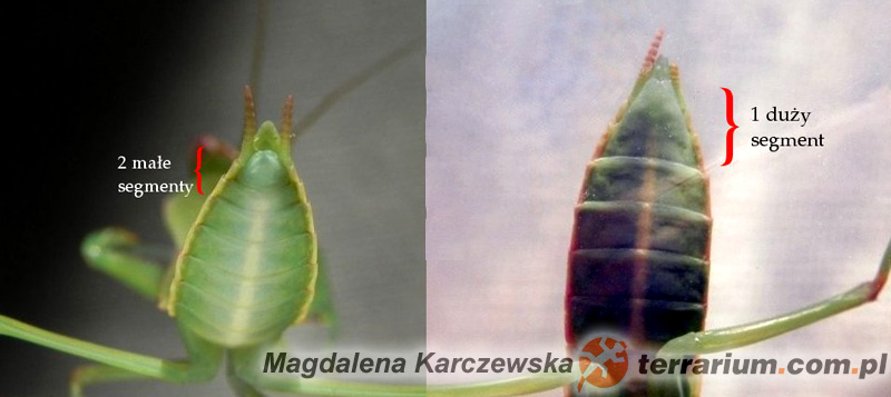 - Samica: 6 segmentów licząc na spodzie odwłoka. Imago masywniejsze od samca. Czułki krótsze i cieńsze.
