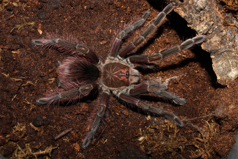 Dla dorosłych samic odpowiednie będzie terrarium o wymiarach minimum 45x40x30, jako podłoże można zastosować torf kwaśny lub substrat kokosowy. Warstwa podłoża powinna wynosić minimum 10cm, jako kryjówkę możemy zastosować kawałek korzenia lub tuby korkowej. Warto także w terrarium umieścić miseczkę z woda oraz zasadzić żywe rośliny, które pomogą utrzymać odpowiednia wilgotność.