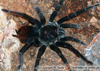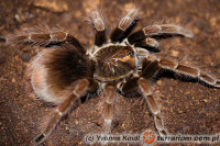 Ładnie ubarwiony ptasznik. Samica tuz po linieniu ma piękny, fioletowy odcień na pierwszym członie odnóży, a na ciemnobrązowej tarczce grzbietowej różową plamkę w okolicach oczu. Reszta kończyn jest brązowa, odwłok tej samej barwy, porośnięty rzadkimi, jaśniejszymi włoskami. Przed linieniem samice są z reguły rudawo-brązowe. Młode są czarne, z brudnopomarańczowymi kończynami. Około 4-5 wylinki ich ubarwienie zmienia się na bardziej rude, a odwłok porośnięty jest już długimi, pomarańczowawymi włoskami.