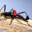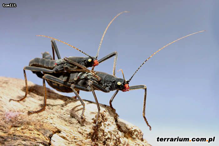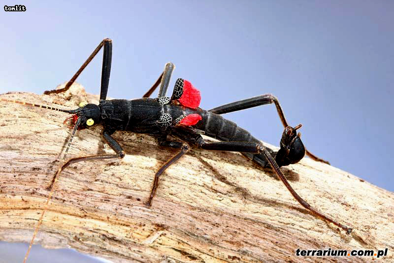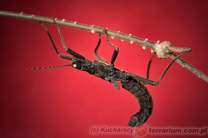 Samice tego gatunku dorastają do 8 cm, większe od samców, znacznie masywniejsze. Samce są natomiast mniejsze i szczuplejsze od samic, dorastają do 5 cm, na końcu odwłoka mają widoczny charakterystyczny narząd kopulacyjny. Charakterystyczną cechą tego gatunku jest jego wygląd: czarne, matowe ciało oraz czerwone mikro skrzydełka, pokrywy skrzydeł od zewnątrz z wyraźnym rysunkiem szarych żyłek. Ich oczy są kontrastowo żółte, a otwór gębowy ma kolor czerwony. Czułki mają około 4 cm długości i są koloru czarno – białego. Chitynowy oskórek w dotyku i z wyglądu przypomina zamszowy materiał.
