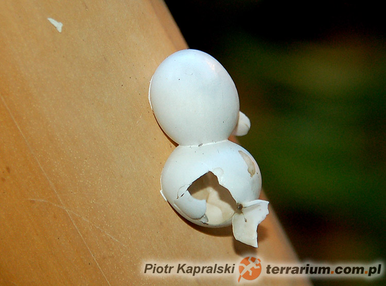 Inkubacja trwa ok. 70-106 dni w temperaturze 23-32°C. W temperaturze niższej tj. 20-25°C inkubacja trwa 98-132 dni. Młode po wykluciu mają około 4 cm i są miniaturkami samic, w ich ubarwieniu dominuje głównie kolor brązowy. Jeśli jaja były inkubowane w terrarium to młode po wykluciu trzeba natychmiast przenieść, w przeciwnym wypadku zostaną zjedzone przez osobniki dorosłe. W naturze zjawisko kanibalizmu było u tego gatunku obserwowane u samców – samiec włączał młode osobniki do swojego jadłospisu.