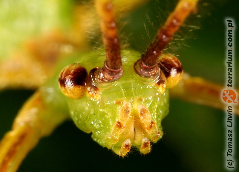 Klujące się liśćce są koloru brązowego z nielicznymi białymi plamkami, długości 1 cm. Młodziutkie liśćce są urodzonymi sprinterami dopiero po około 2 tygodniach ich zapał szybkiego poruszania się maleje. Po kilku dniach zmieniają kolor na zielony. Przez lata hodowli wykształcił się mit mówiący o tym że młode liśćce zmieniają kolor na zielony dopiero wtedy gdy zaczną przyjmować pokarm. Jest to nieprawda. Najprawdopodobniej kolor brązowy służy im po to aby w ciągu 2-3 najbliższych dni młode liśćce znalazły roślinę służącą im za pokarm i muszą przemieszczać się po podłożu gdzie jest ciemne tło. Dopiero po kilku dniach wykształca się kolor zielony, który służy im za kamuflaż już na roślinie żywicielskiej. Larwy przechodzą 6 linień, po 6 wylince przyjmują postać dorosłą (imago). Ilość wylinek jest taka sama w przypadku samca jak i samicy.