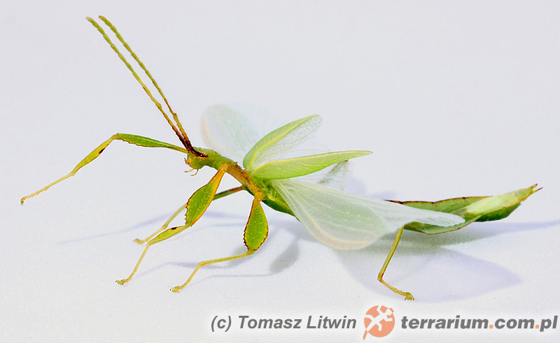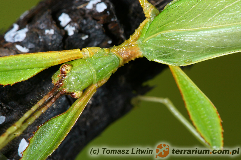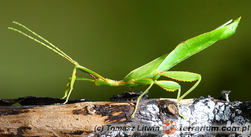 Wyraźnie różni się od samca jest duża, szeroka i masywna, wielkości od 6,5 do 7,5 cm, posiada jedną parę szerokich skrzydeł na których występują przebarwienia. Samica niezdolna do lotu ze względu na swoją masywna budowę. Odwłok mocno spłaszczony przypominający liść. Posiada parę krótkich czułek długości około 0,5cm. Najczęstszą barwą samicy to kolor zielony często występujący w różnych odcieniach. Niekiedy spotykane są osobniki podchodzące pod kolor żółty (słomiany) co jest dużą rzadkością. Składa do 200 jaj, ciekawostką jest to, że jajka składane są tylko w nocy a efekt jest taki jakby ktoś strzelał z czegoś do terrarium. Samice żyją około 6 miesięcy przy zapewnieniu im odpowiednich warunków.