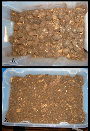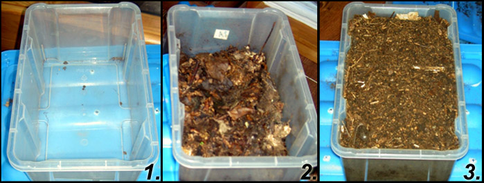 - Na warstwę humusu nakładamy dużą ilość (aż do pokrywy) drobno rozdrobnionego humus i wpuszczamy larwy do tak przygotowanego pojemnika.