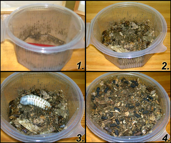 - Pojemnik do hodowli zbiorczej powinien być niewysoki lecz szeroki. Wsypujemy do niego włókno kokosowe, lub rozdrobniony przez chrząszcze humus, na grubość około 5-8cm.