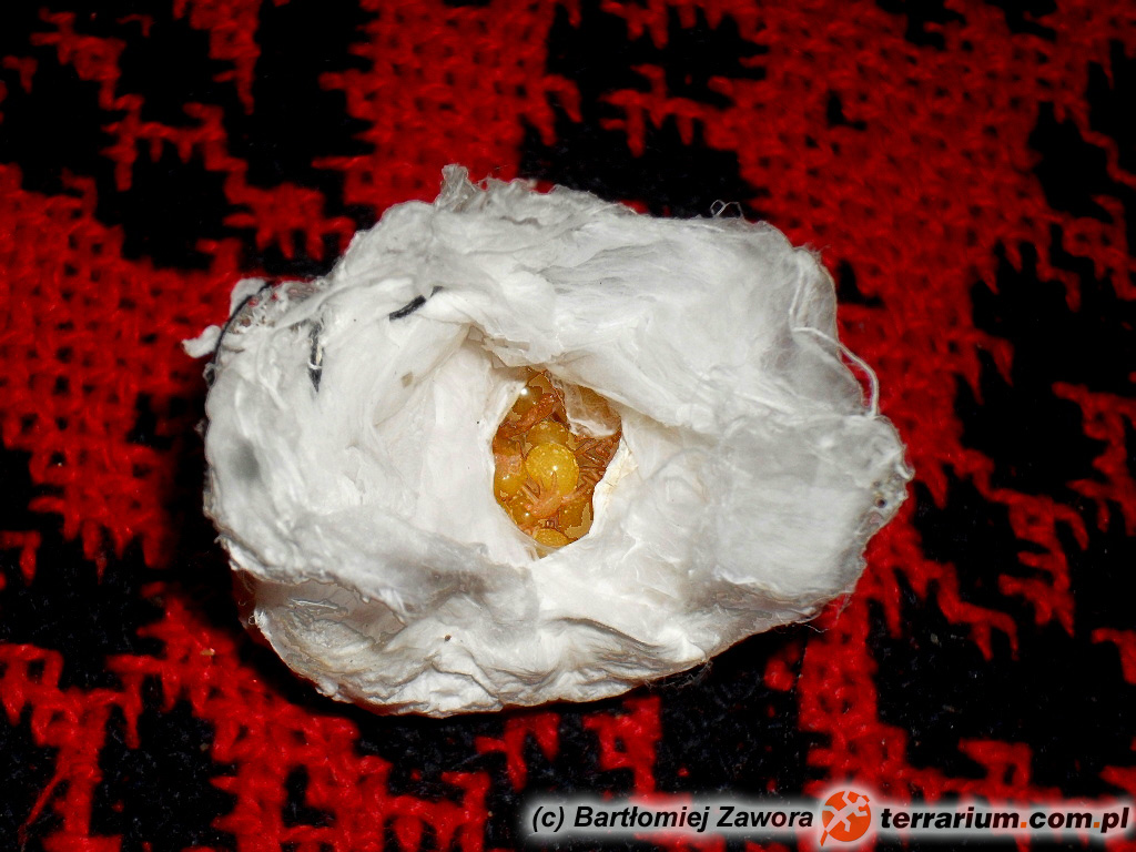 - 01.10.15 – odebranie kokonu w środku jaja, zaszyłem i przełożyłem kokon do „inkubatora” – braplast przy kablu, podłoże to torf kokosowy z wermikulitem. Kokon położyłem jak zawsze na plastikowej pokrywce.