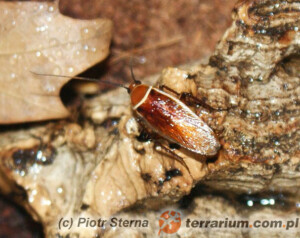 Jest to gatunek jajorodny, ooteka długości około 5 mm, jasnobrązowego koloru, zawierająca około 20 jaj. Inkubacja ooteki trwa niecały miesiąc. Dymorfizm płciowy widoczny, samiec jest jednolicie ubarwiony, natomiast samica ma ciemniejszego koloru skrzydła. Ciekawe w obserwacji są zaloty tego karaczana, polegające na bieganiu za sobą, momentami dość zabawnie to wygląda.