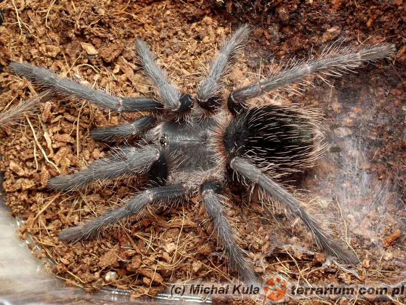 Samica osiąga 9-10 cm (głowotułów + odwłok) z nogami do około 22 cm. Całe ciało dorosłych samic jest czarno-szare pokryte długimi gęstymi włoskami. Młode tego gatunku są różowe z ciemną plamką na odwłoku. Kolory dorosłych osobników przybierają po 6-7 linieniu, bardzo łatwo pomylić je w pierwszych fazach rozwoju z pająkami takimi jak Acanthoscurria, Brachypelma, Nhandu.