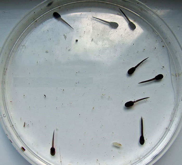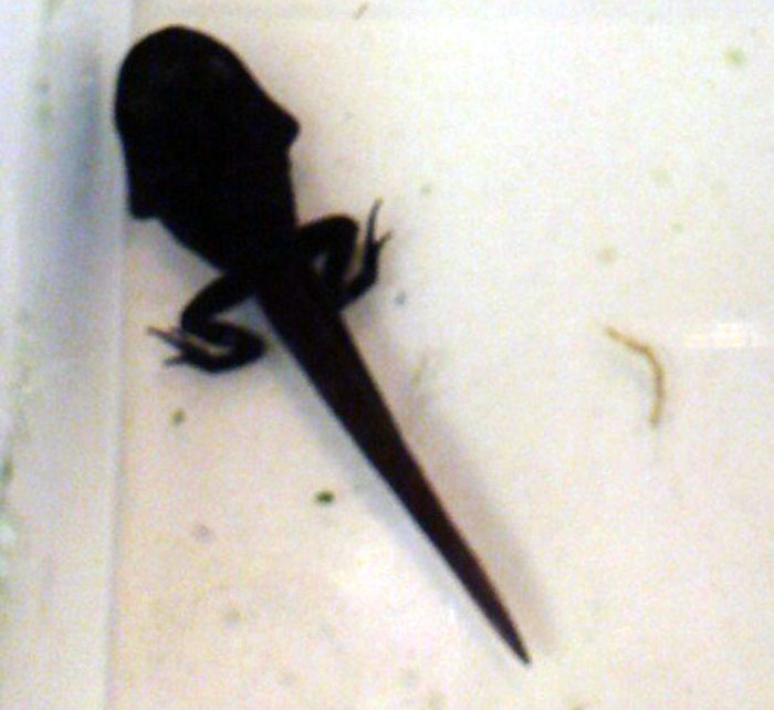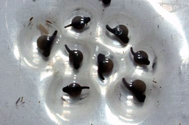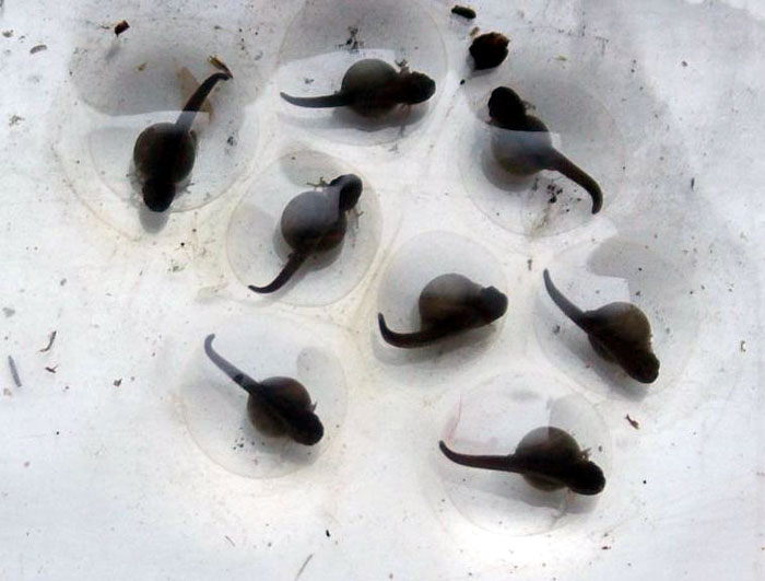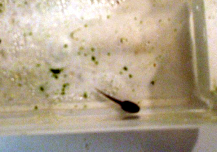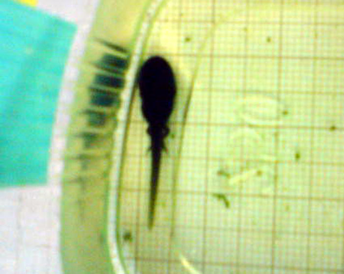 W osiemnastym dniu kijanki były już zupełnie wykształcone i bez osłonek jajowych, wielkości 10 mm. Z moich obserwacji wynika, że kijanki nie zjadają swoich osłonek jajowych. Początkowo były mało ruchliwe, ale później się ożywiły (Fot. 11).