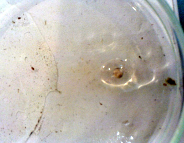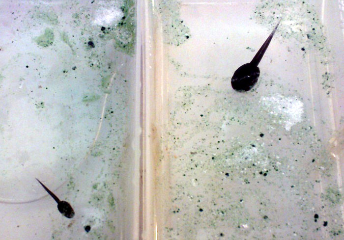 Przyczyn pleśnienia skrzeku może być wiele. Najczęściej jest on niezapłodniony, tak jak ten na zdjęciu (Fot.12). Ale równie dobrze może on być zakażony przez grzyby, co oznacza że w naszym terrarium nie dzieje się dobrze. Najlepiej wtedy wymienić całe podłoże i dokładnie wymyć terrarium. Pamiętajmy jednak aby nie używać żadnych detergentów chemicznych bo możemy zaszkodzić naszym żabkom. Najlepszym preparatem do odkażania jest Vircon, można go dostać u lekarzy weterynarii.