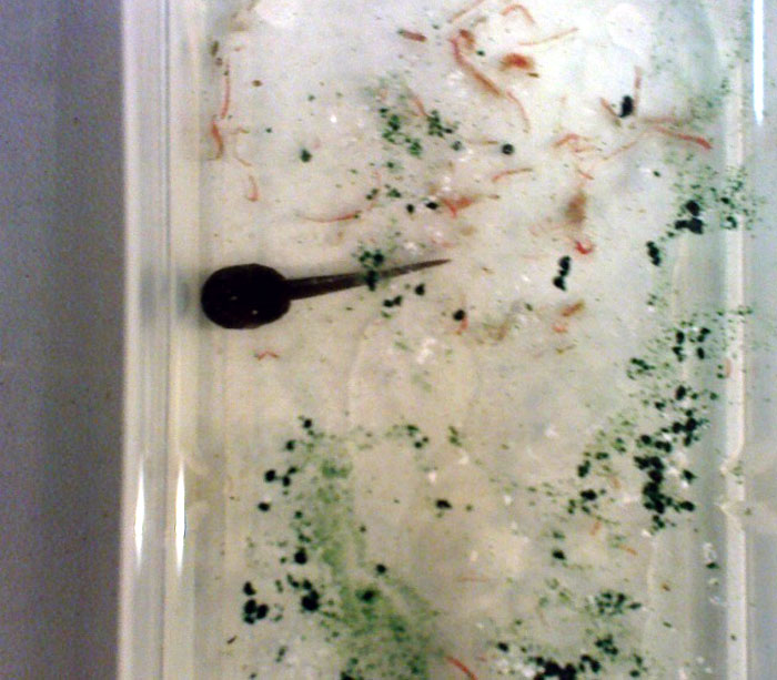W momencie kiedy kijanka zaczyna resorbowanie ogona (Fot.21) można przestać podawać jej pokarm. Kijanka w tym okresie główną energię czerpie ze składników zawartych w ogonie. Ogon zostaje w całości wchłonięty i od tej pory żabka zaczyna nowe życie.