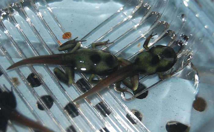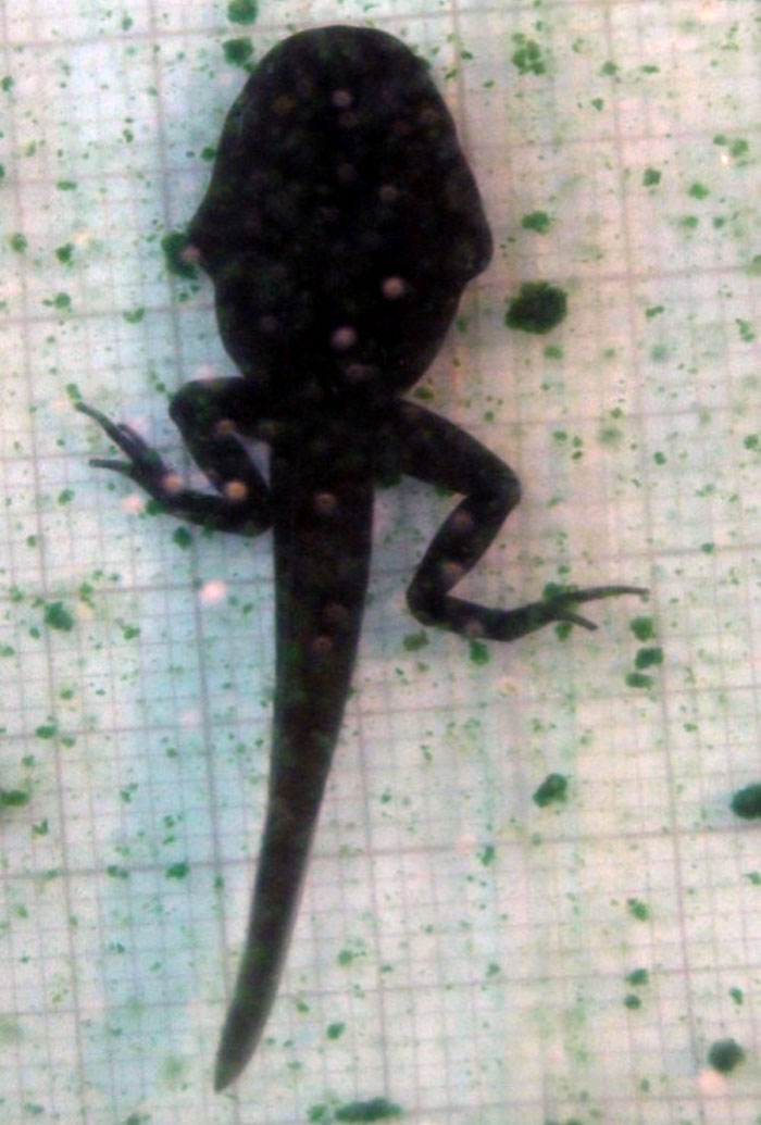 Kiedy u kijanki zaczynają pojawiać się przednie kończyny (Fot.20) należy obniżyć poziom wody i wstawić do pojemnika np. mały kamień tak aby kijanka mogła wyjść. W przeciwnym wypadku kijanka może się utopić. W tym czasie zanikają skrzela zewnętrzne, wykształcają się płuca, kijanka zaczyna oddychać powietrzem atmosferycznym. Można w tym okresie łączyć je w grupy ponieważ zanikają u nich popędy kanibalistyczne.