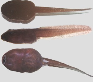 Rozwój zarodków przebiega bardzo szybko. Dla porównania zdjęcie zrobione następnego dnia. Zarodki wyglądają już prawie jak kijanki; dobrze widoczne skrzela zewnętrzne i wyraźnie zaznaczony ogon (Fot.9). Przy głowie widać jeszcze zapasy żółtka.