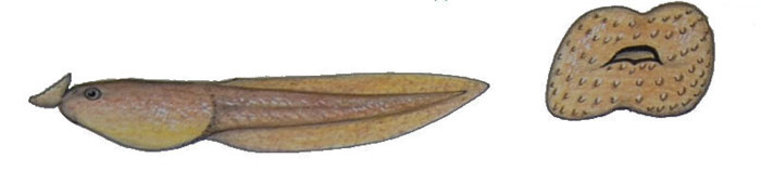 Fot. 4 Oophaga (Dendrobates) pumilio – kijanka i budowa aparatu gębowego (Walls, 1994) – Rozwój kijanek drzewołazów w warunkach terraryjnych Kijanki te często mają duże owalne brodawki dookoła pyska i zredukowany rząd ząbków. Owalne kąciki ust mogą być ciągłe albo ząbkowane.