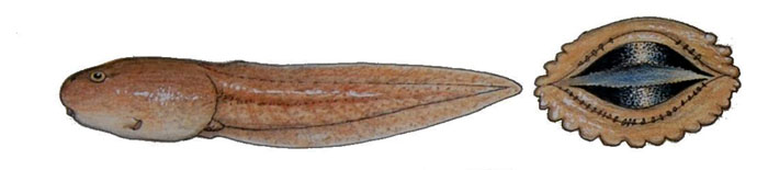 Fot. 2 Kijanka D. auratus i rysunek ząbków rogowych (Thomas, 2008) – Rozwój kijanek drzewołazów w warunkach terraryjnych - Druga grupa ma słabo ząbkowane tarczki rogowe i skłonność do odżywiania się małym detrytusem różnego typu łącznie z algami i organicznymi szczątkami (Fot.3).