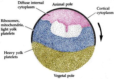 W ciągu pierwszych dni można sądzić, że niewiele się dzieje ze skrzekiem. Są to jednak tylko pozory. Wewnątrz jaja zachodzą liczne podziały komórkowe. Pierwsze z nich to podziały mitotyczne bruzdkowania. W czasie tego okresu podziały są bardzo szybkie bez dzielących je okresów wzrostu, tzn. że komórka jajowa nie zwiększa swojej masy lecz przybywa w niej komórek. Tempo bruzdkowania zależy, jak wszystkie procesy biologiczne, od temperatury. Są różne typy jaj i różne typy bruzdkowania. Jaja płazów są jajami telolecytalnymi, tzn. są silnie spolaryzowane – w jednej części zebrane jest żółtko (biegun wegetatywny) zwykle koloru jasnego, po przeciwnej stronie znajduje się lżejszy obszar, który pod korteksem ma barwniki (biegun animalny) zwykle koloru ciemnego, a po środku znajduje się warstwa koloru szarego zwana szarym półksiężycem (Fot.5).