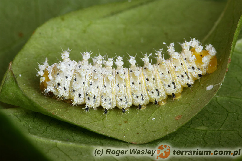to typowa gąsienica posiadająca wyraźnie wyodrębnioną głowę z aparatem gębowym gryzącym oraz 13 bardzo podobnych i pozbawionych pancerza segmentów ciała. Tułów wyróżnia się od odwłoka tylko posiadaniem trzech par krótkich odnóży. Na pięciu segmentach odwłoka (3, 4, 5, 6 i 10) posiada po parze tak zwanych posuwek, czyli przyssawek pełniących funkcję odnóży, ale oczywiście nimi nie będących (owady mają zawsze 3 pary odnóży). Posuwki pełnią jednak rolę głównego narządu ruchu, gdyż umożliwiają przyczepienie się do podłoża dużo silniej niż za pomocą prawdziwych odnóży Gąsienica po wykluciu ma 2 milimetry długości, jest przezroczysto zielona i posiada czarną głowę oraz ciało pokryte skupiskami czarnych szczecinek. Jej wygląd jest wówczas raczej mało ciekawy, tym bardziej, że ze względu na wielkość słabo ją widać. Rośnie jednak szybko przechodząc przez 6 stadiów larwalnych i jako gotowa do metamorfozy larwa ma 6 cm długości i waży trochę ponad 2 gramy. Jest wówczas turkusowa, ma beżową głowę i zamiast skupisk szczecinek posiada na ciele wypustki, przypominające miękkie kolce.