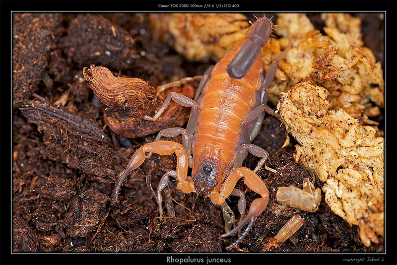 | Rhopalurus junceus | Wielkość tego skorpiona jest dość zróżnicowana, zależnie od populacji jest to 9-12 cm. Również jest to skorpion nadrzewny i wymagający pionowych powierzchni, chociaż moim skorpionom zdarzało się przechodzić wylinki bez nich. Skorpion ten posiada piękne ubarwienie – szczególnie młode osobniki. Posiada średniej siły jad LD wynosi 8.0mg/kg. Skorpion jest bardzo socjalny, można trzymać ze sobą nawet młode osobniki. Młodziaki przy dobrych warunkach dorosłość osiągają nawet pół roku po narodzinach. U tego gatunku zaobserwowano zjawisko strydulacji – zaniepokojone wydają dźwięk przypominający grzechotanie. | |