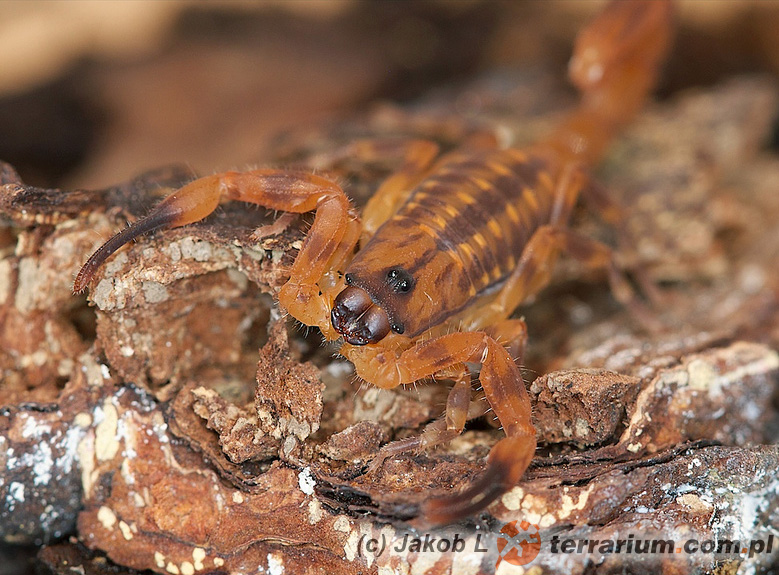 | Lychas mucronatus | Dość niewielki (4-6,5 cm) lecz piękny skorpion. Tak jak i jego poprzednicy jest to skorpion nadrzewny, co oznacza że w wystroju terrarium nie może zabraknąć pochyłych powierzchni. Skorpion ten posiada jad średniej siły, cytat ze scorpiones.pl: „Nie jest uważany za stanowiący zagrożenie dla człowieka. Nieznana jest wartość LD50, lecz z raportów ukąszeń wywnioskować można, że spowodować potrafi silny, wielogodzinny ból. „Dobrze spisuję się w grupach i jest aktywny. Będzie na pewno doskonałym obiektem do obserwacji. Jego dostępność w handlu jest średnia – trzeba poszukać i popytać żeby dostać. Moim zdaniem warto, choćby ze względu na jego ubarwienie. | |