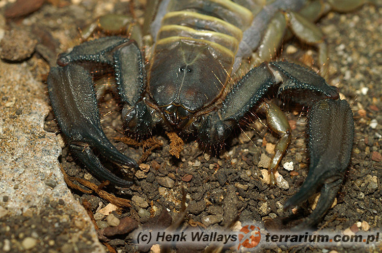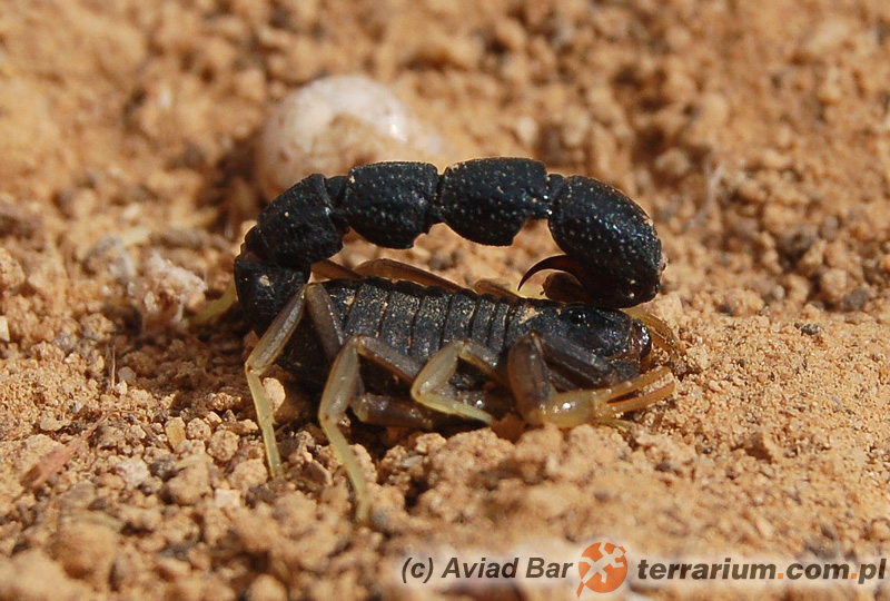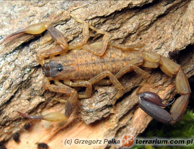 | Scorpio maurus | Średniej wielkości skorpion (5-10cm). Ceniony za swój ciekawy wygląd, szczególnie morph „palmatus”. Odnośnie jadu – LD50 na poziomie 9.37 mg/kg – a więc ukąszenie może sprawić pokaźny ból. Osobiście nie polecam, padliwy dość, większość pochodzi z odłowu. |