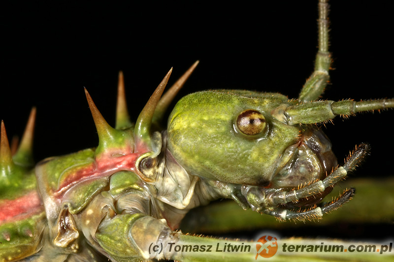 Młode trzymamy w takich samych warunkach co dorosłe osobniki, przy czym należy pamiętać o regularnym zraszaniu terrarium wodą. Młode owady często odwracają się kolcami na grzbiecie w stronę domniemanego zagrożenia. Bardzo szybko rosną, w temp. 20-23°C rozwój od L1 do imago trwa ok. 4 miesięcy.