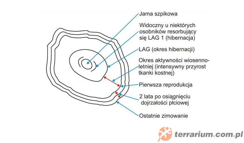 Jedną z metod określania wieku u płazów i gadów jest skeletochronologia. Wiek określany jest na podstawie liczby warstw przyrostów rocznych , które są widoczne na przekrojach poprzecznych lub podłużnych kości długich (np. paliczków). Kości płazów nie ulegają przebudowie w czasie rozwoju. Kolejne warstwy odkładają się w kierunku zewnętrznym. Warstwy składają się z szerokich pasm tkanki kostnej, które kształtują się w czasie intensywnego przyrostu kości w okresie wiosenno – letnim (maksymalnej aktywności – wzrost, odżywianie), oraz z wąskich linii sklejania (okres hibernacji) [schemat niżej]. Pierścień zagęszczonej tkanki kostnej, który powstaje w czasie hibernacji to tzw. LAG (linia zahamowanego wzrostu). Wiek odpowiada liczbie „lagów” na przekroju paliczka. Zwierzęta te rosną przez całe życie, dopiero po osiągnięciu dojrzałości płciowej wzrost nie przebiega już tak intensywnie jak wcześniej. W wyniku procesu wewnętrznej resorpcji jamy szpikowej kości (produkcja erytrocytów krwi) może dojść do zaniku wczesnych warstw przyrostu kości. Zwykle dochodzi do strawienia LAGu 1, a rzadko również LAGu 2. Aby uniknąć błędu w obliczeniach wieku wykonuje się tzw. kalkulację wsteczną. W tym celu porównuje się średnicę jamy szpikowej i LAGu 1 ze średnią z pomiarów średnicy jamy szpikowej i średnicy LAGu 1 u osobników po pierwszej hibernacji. W przypadku, gdy okaże się, że jama szpikowa badanego osobnika jest większa od LAGu 1 osobnika po pierwszej hibernacji, tzn., że należy dodać 1 rok do otrzymanego wieku badanych organizmów. W taki sposób określimy prawidłowo wiek zwierząt, bez konieczności ich uśmiercania (paliczki są obcinane).