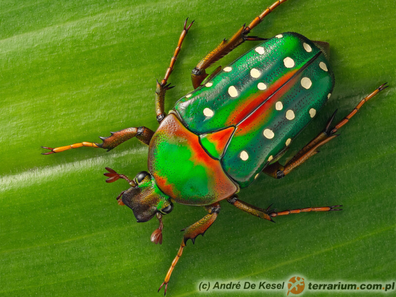 Pochodząca z Zairu Stephanorrhina guttata jest bardzo atrakcyjnie wyglądającym chrząszczem. Jako imago osiąga od 2,5 do 5,5 cm. Żyje średnio 4 miesiące, a rozwój larwy trwa 6 miesięcy. Długość życia larw i imago zależy od temperatury. Jeśli temperatura jest niższa to rozwój owada się wydłuża, a jego aktywność maleje. Ten masywny chrząszcz posiada owalny kształt. Jego ubarwienie jest bardzo ładne, przeważają barwy zielone, a na krawędziach skrzydeł i ciała znajdują się pomarańczowe akcenty. Na powierzchni skrzydeł możemy dostrzec małe szare kropeczki, które atrakcyjnie wyglądają. Z wiekiem kolory owada zaczynają ciemnieć.