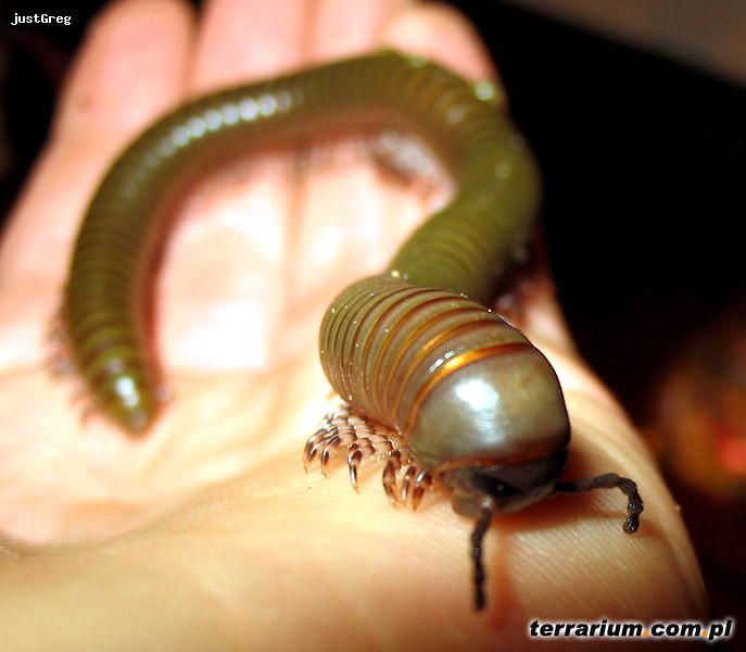 Osiągają dojrzałość płciową po 2-3 latach. Wyraźny dymorfizm płciowy u dorosłych osobników, samce są zielonkawe a samice są w tonacji brązowawej. Samce są również zdecydowanie mniejsze. Po pewnym czasie i przy komfortowych warunkach para krocionogów zainteresuje się sobą. Dochodzi w tedy do gry miłosnej, która kończy się długą kopulacją. Po pewnym czasie samica składa jajeczka do ziemi, nie opiekuje się nimi. Następnie po upływie pewnego czasu wykluwają się młode.