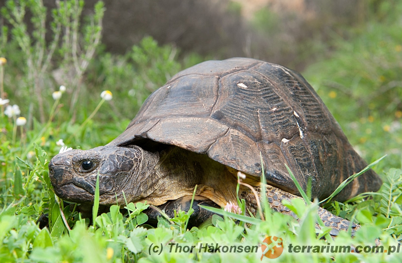 Żółwie lądowe z południa Europy zamieszkują przede wszystkim śródziemnomorską makię (macchia). Jest to wtórna formacja roślinna, jaka powstała w tych rejonach na miejscu rozległych, ale już dawno i omal doszczętnie wyciętych lasów. Pospolitym widokiem w krajobrazie makii są luźno rozrzucone, zbite, ciemnozielone kępy karłowatych, krzewiastych dębów o małych, kolczastych liściach, bardzo podobnych do ostrokrzewów. Fakt, że są to dęby, widać dopiero pod samą rośliną, bo grunt jest tam usłany masą żołędzi. Czego jednak z daleka nie widać, a co dominuje w makii, to przede wszystkim przeraźliwie uciernione suchorośla i silnie aromatyczne zioła, które po wiosennym wegetacyjnym rozkwicie zamierają aż do następnej wiosny, kiedy znowu, na kilka krótkich miesięcy, zazieleniają się ponownie.