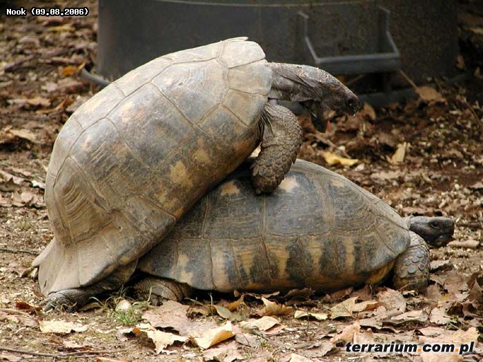 Samice bardzo często – zwłaszcza w warunkach, w których trudno o odpowiednie miejsce do złożenia jaj – nerwowo wędrują po wybiegu lub terrarium, jakby czegoś intensywnie poszukując. Kiedy już żółwica znajdzie odpowiednie miejsce, zapada w swoisty trans. W tym czasie uruchamiają się u niej kolejno poszczególne etapy procesu składania jaj. Najpierw wykopuje komorę gniazdową, po czym bardzo staranne formuje jej wnętrze. Następnie, w około minutowych odstępach, składa kolejno jaja i przy tym zdumiewająco troskliwe układa je we wnętrzu komory.
