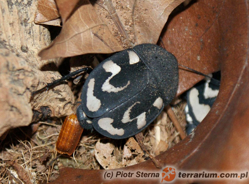 Młode larwy żerują w podłożu – warto zapewnić im próchno oraz liście. Uzupełnieniem pokarmu mogą być miękkie, przejrzałe owoce tropikalne (awokado, mango, ananas, kiwi itp.) oraz suchy pokarm dla psów. Owoce należy podawać w ilości, która zostanie zjedzona w ciągu 2-3 dni. Niezjedzone resztki usuwamy ze zbiornika.