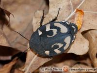 W opisanych warunkach larwy dorastają po około 6-7 miesiącach. Po kolejnych 2 tygodniach osiągają dojrzałość płciową. Samice zagrzebują ciemnobrązowe prostokątne ooteki w podłożu, z reguły w ciągu kilku godzin od uformowania ooteki, w przypadku kiedy nie są w stanie znaleźć miejsca o odpowiedniej wilgotności ściółki potrafią nosić ootekę nawet 3-4 dni. Po około 5-6 tygodniach inkubacji z ootek wykluwają się młode (kilka-kilkanaście sztuk). Młode zagrzebują się od razu w podłożu, toteż można nie zauważyć ich obecności. Ooteki można inkubować w terrarium z dorosłymi, nie ma konieczności usuwania ich do inkubatora.