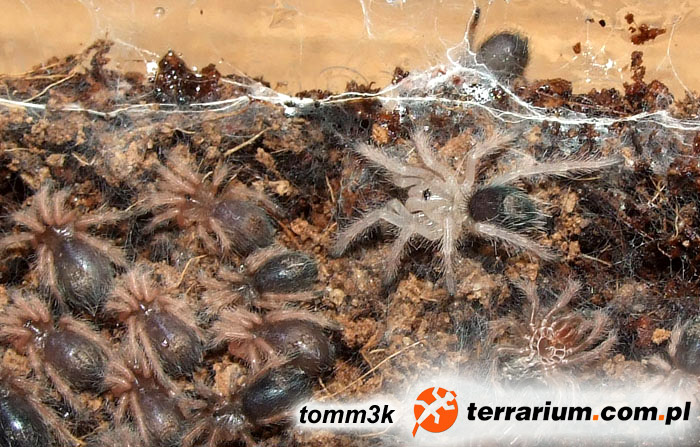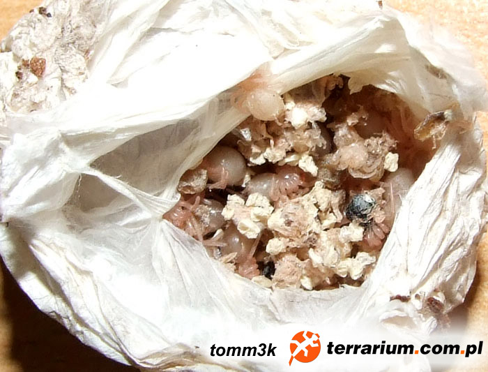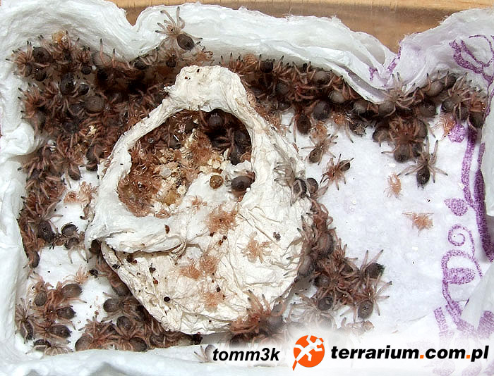 | Rozwój młodych: | Po odebraniu kokonu ujrzałem nimfy II. 2011-01-06 – ku mojemu zaskoczeniu młode zaczęły przeobrażać się w nimfy III. Pierwszy osobnik L1 pojawił się po niecałych czterech tygodniach (2011-01-30). W ciągu kilkunastu dni niemal wszystkie osobniki były już w stadium L1. | |