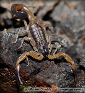 Jeśli dysponujemy dorosłą parą skorpionów, rozmnażanie nie stanowi większego problemu. Moja grupa hodowlana skorpionów była trzymana oddzielnie. Po osiągnięciu przez nie dojrzałości, postanowiłem wpuścić je do wspólnego terrarium. Samego momentu zapładniania samiczek niestety nie zauważyłem, lecz po kilku dniach znalazłem na postawionym po ukosie kawałku tuby korkowej, spermatofory złożone przez samce. Ciąża moich samic trwała około czterech miesięcy, więc można powiedzieć że całkiem szybko. Gdy samice były już w wysoko zaawansowanej ciąży, na czas porodu postanowiłem je rozdzielić. Samice w pierwszym miocie dały średnio po 15 młodych. Drugi miot którego się doczekałem był już mniej liczny ok. 10-12 młodych, a w trzecim miocie 6-8 młodych. Zapewne było to spowodowane tym że samice rodziły kolejne młode bez następnego kontaktu z samcem. By młode nie zjadały się podczas zrzucania kolejnych wylinek, zaraz po zejściu z samicy postanowiłem je rozdzielić.