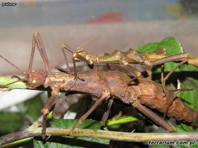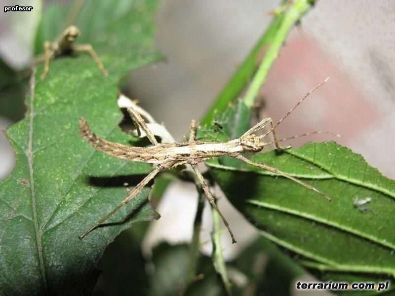 Dorosłe owady hodujemy w terrarium o wymiarach 30x30x30 cm [dł. x szer. x wys.].Takie terrarium wystarczy dla 2-3 par. Dno wysypujemy torfem lub włókniną kokosową aby straszyki mogły bezpiecznie składać jaja. Jeżeli decydujemy się natomiast na wyłożenie dna terrarium ręcznikami papierowymi pamiętamy o pojemniczku z torfem do którego samice będą składać jaja – brak podłoża odpowiedniego do składania jaj grozi uszkodzeniem pokładełka samicy. W terrarium możemy umieścić konary lub korzenie, które stworzą atrakcyjne kryjówki dla owadów. Gatunek ten lubi nieco wyższą wilgotność, należy zatem zraszać terra regularnie 1-2 razy dziennie. Nie trzeba stosować dodatkowego oświetlenia.