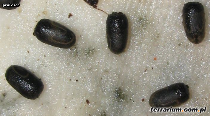 Jaja są koloru czarnego, beczułkowatego kształtu. Długość ok. 5 mm i szerokości 2 mm. Samica zakopuje je na głębokość 3-4 cm w warstwie podłoża.