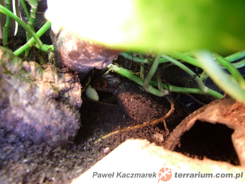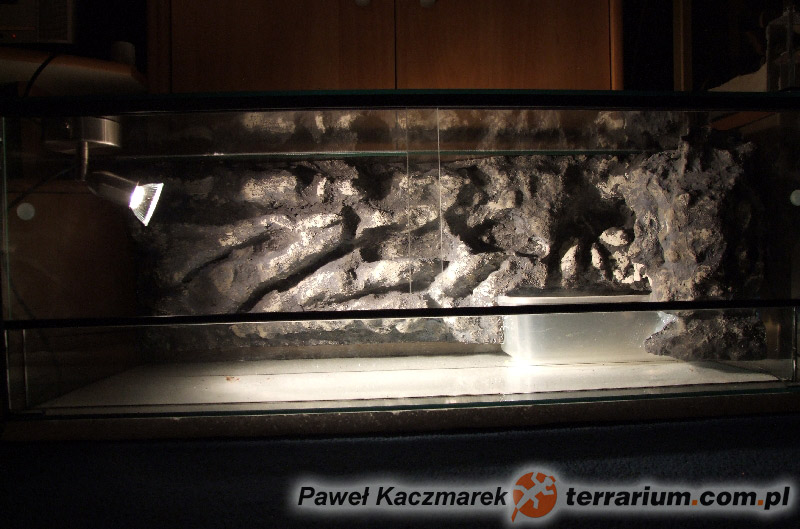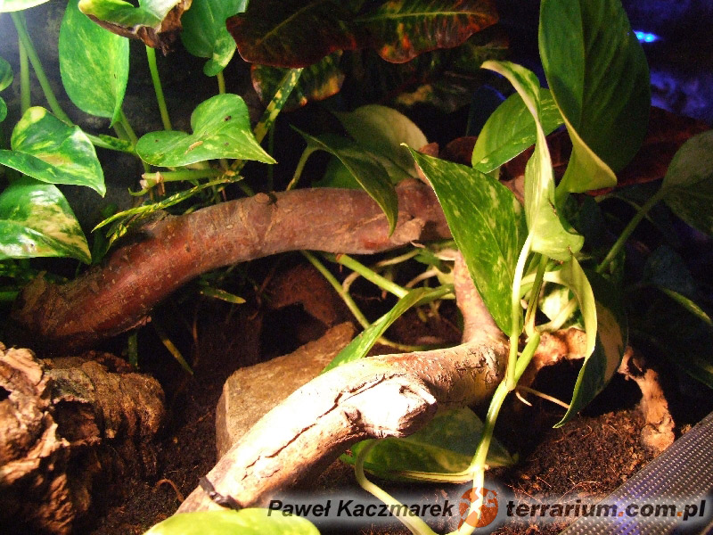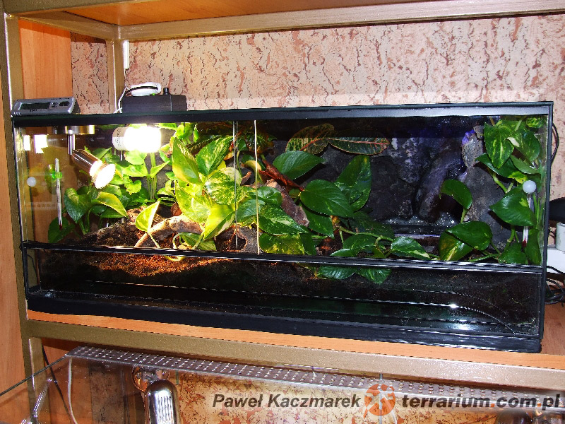 Żadna część terrarium nie jest pozbawiona roślin i kryjówek. Oświetlenie, a także wodospad włączane i wyłączane są automatycznie za pomocą elektronicznego włącznika czasowego. Przedstawiony schemat organizacji terrarium to tylko przykład. Ważne jednak, aby zapewnić jaszczurkom odpowiednie warunki, o których pisałem wcześniej.